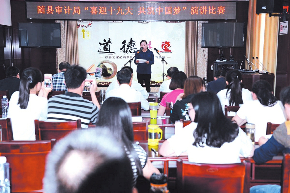 9月22日,随县审计局举行“喜迎十九大,共筑中国梦”演讲比赛,该局干部职工纷纷走上讲台,抒发自己投身审计事业、共圆中国梦的审计豪情,决心以饱满的工作状态、优异的工作成绩,迎接党的十九大胜利召开。(通讯员 谢桂芳摄)