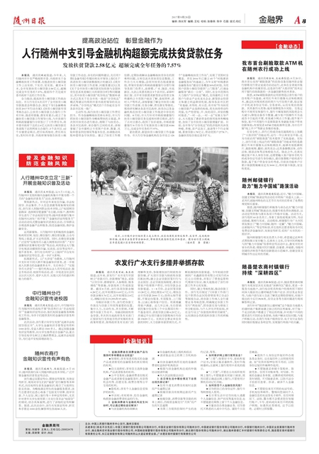 本报讯 通讯员阙波报道:今年来,人行随州市中支严格按照市委、市政府关于金融精准扶贫工作部署,在推进扶贫小额贷款工作上出实招、下实功、见实效。截至8月末,全市发放扶贫小额贷款2.58亿元,