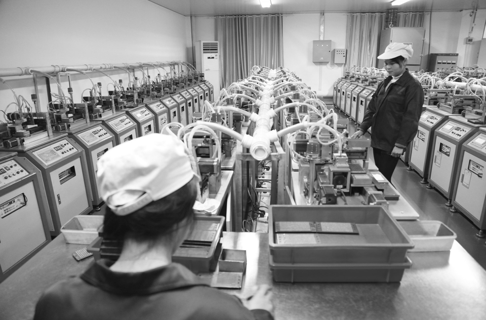 湖北泰晶电子科技股份有限公司掌握国际先进的激光调频技术,针对不同客户的需求调整频率,生产出不同规格的产品。图为该公司万级净化车间。 (本报记者 王璟天摄)