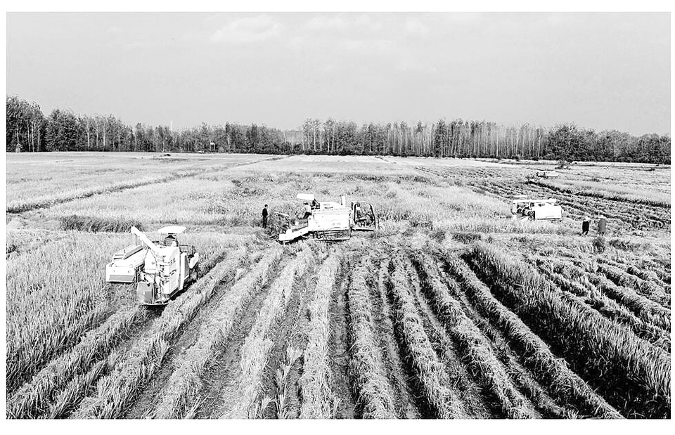 10月19日,连绵阴雨天气终于结束,随县安居镇爱国粮食合作社组织8台联合收割机抢收2500亩水稻,力争颗粒归仓,交售秋粮3000吨。 (本报记者 李文军摄)