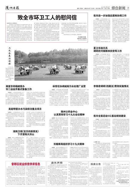 全市环卫工人同志们: 在举国上下欢庆党的十九大胜利召开之际,我们迎来了湖北省第20届环卫工人节。在此,市委、政府向全市环卫工作者致以节日的祝贺和亲切的慰问!向关心、支持、理解环卫事业的