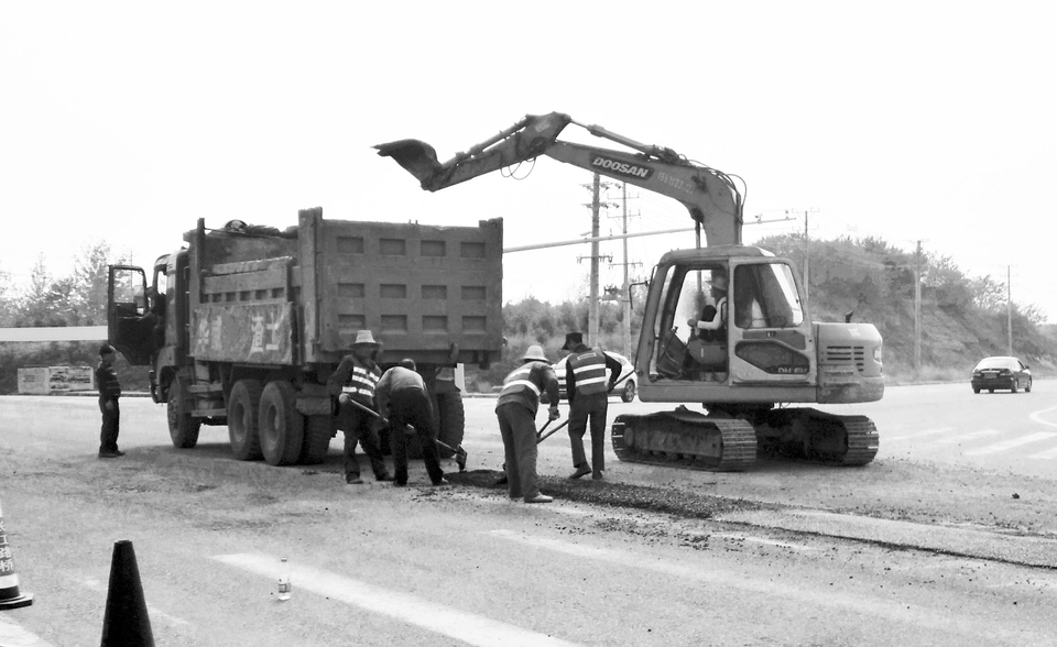 我市公路部门日前对连续阴雨造成的公路损害进行修复整理,确保行车安全。 (本报记者孙洪涛摄)