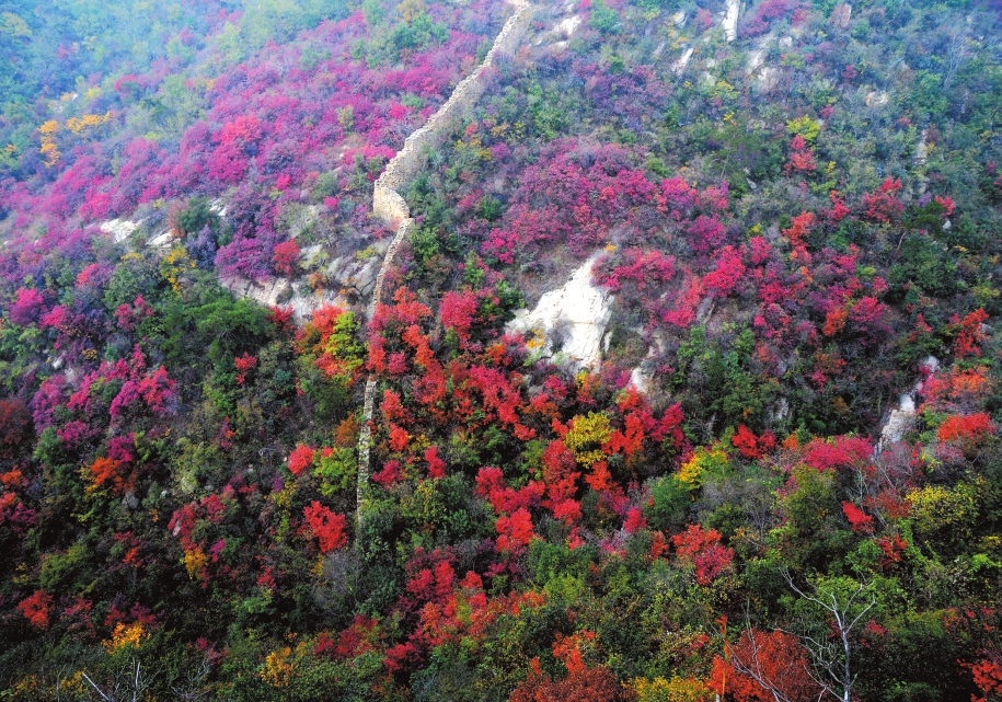 那是一个风和日丽、秋高气爽的下午。山路崎岖,沟壑纵横,进入我们视野的是看似近实则远的桐柏山太白顶下的盛家寨,在红叶簇拥下,更显示出古朴苍桑之美。我们顺着蜿蜒起伏的山路,爬上了山顶。山岭上生长着茂密的天然次生林,植物种类繁多,有几十种秋天红叶的植物。每到中秋轻霜过后,漫山遍野层林尽染,赤橙黄绿紫,争色斗艳,但红得鲜艳、红得热烈、红得美丽、红得时间最长数黄栌、五角枫和三角枫。漫山红叶中,最大的家族要数黄栌,最漂亮的当属五角枫。经霜一点鲜红亮丽,不掺杂色,鲜艳持久,红得让人难以相信是自然生成。举目眺望,沟沟垴垴,山山巅巅,簇拥相依,片片相连,漫山遍野的红叶扑面而来,如霞似火,流光溢彩,镶嵌着松树、萃柏的树叶鲜绿如夏、色彩斑斓的森林之中,显得更加层次分明,错落有致。还有那以菊科为主秋天开放的各种野花,在林下、在路旁、在溪边,争芳斗艳。绚丽挺拔的桐柏山把这五颜六色的山岭和那蓝天白云一同揽入她那宽阔的怀抱之中,我似乎走进了安徒生的童话世界。在这色彩斑斓的世界里,最亮丽、最显眼、最让人喜爱的便是红叶,像一朵朵明艳欲滴的彩霞,像一团团燃烧跳动的火焰,让人炫目,让人留恋,让人震撼,让人肃敬,让人遐想,让人寄托美好的向往和淡淡的情愫。当我遥望无边的红叶被落日照耀得如同燃烧的火焰时,我的心醉了,醉得全身的鲜血都在沸腾激荡!此时尘世的纷争、人生的浮沉全都伴随着片片飘洒的红叶飘向远方!