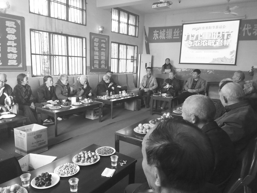 ◀ 10月26日上午,缫丝社区、湖北省纺织工业实验工厂联合主办的重阳节茶话会活动在社区会议室举行,社区老年朋友们齐聚一堂,共同度过了一个温馨快乐的重阳节。 (通讯员凡从丽摄)