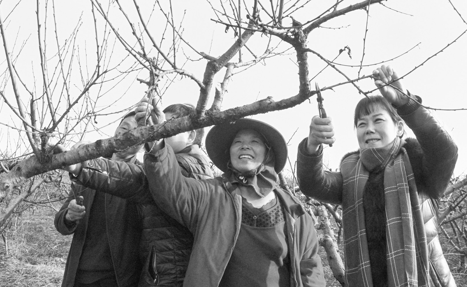 随县厉山镇财政所干部邀请农技专家为驻村贫困户何桂芹示范修剪果树,助力脱贫。(本报记者 李文军 通讯员 龚承斌 郑文友 摄)