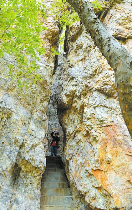 石峰劈裂,孤立高耸,岌岌可危。气势磅礴的场景,惊心动魄的画面。风霜雨雪的雕琢,日月星辰的打磨,顽固的火山岩成了理想的作品。断崖绝壁,锦挂帛垂,一幅幅内涵丰富的无字天书,每个仰视它们的游客,凭着各自的生活阅历,都能看到令生命激动的内容……