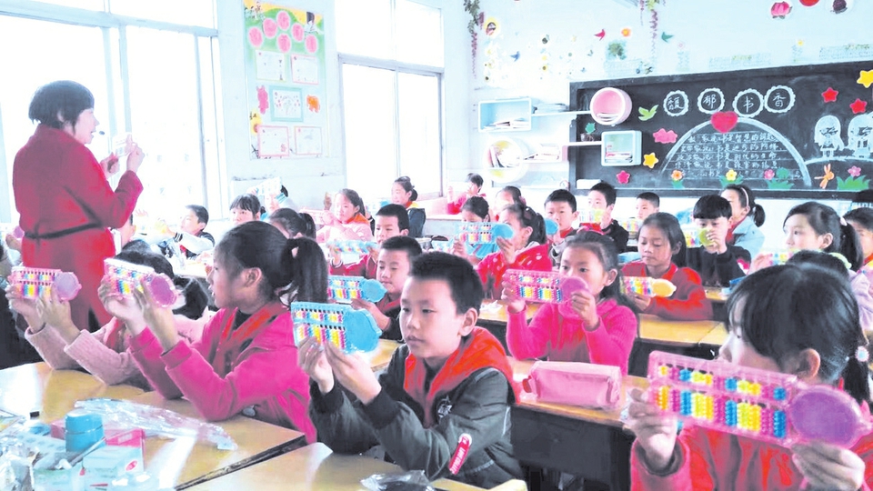 随县尚市镇中心小学为了践行新教育理念,丰富学生的课外活动,组织全校师生开展丰富多彩的新教育活动课程。图为学生们饶有兴致地开展学习珠心算。(通讯员 孙小红摄)
