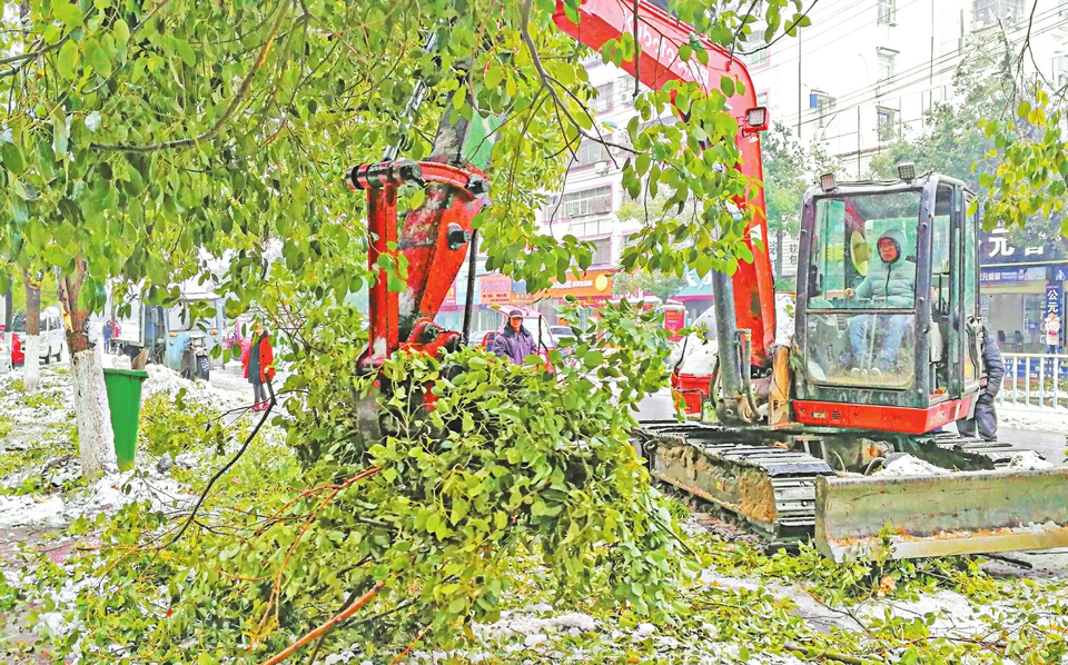市园林局绿化管理所组织人员和机械,对随州城区因雪灾损毁的树木进行清理,为下一步修剪整枝作准备。(本报记者 李文军摄)