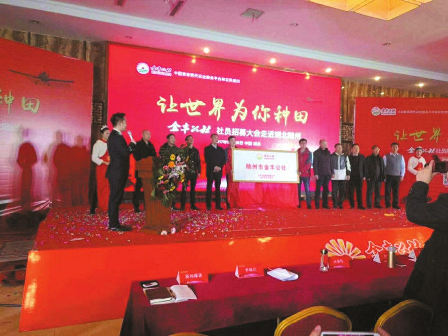 2017年12月28日,随州市金丰公社成立暨首届社员招募大会在曾国府酒店隆重召开。主管部门、新闻媒体、合作企业以及1200多家种田大户共同见证了随州市金丰公社成立。