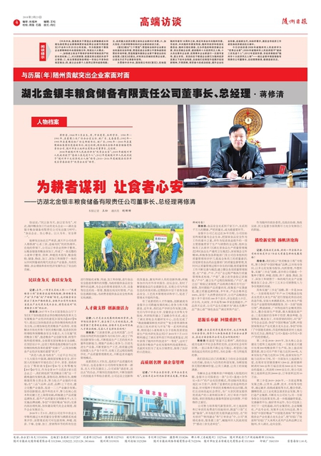 与历届(年)随州贡献突出企业家面对面湖北金银丰粮食储备有限责任公司董事长、总经理·蒋修清人物档案 蒋修清,1968年9月出生,男,中共党员,本科学历。1990年—1991年,在襄樊二米