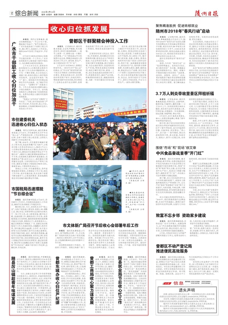 本报讯 特约记者彭晓华、通讯员杨辉报道:“一年之计在于春,撸起袖子加油干。”春节长假过后,广水市各地各部门干部职工收心归位,凝心聚力,迅速进入工作状态,确保2018年各项工作起好步、开好