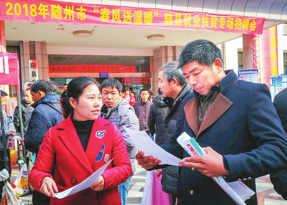 2月24日,全市“春风送温暖”随县就业扶贫首场招聘会开锣,来自该县各乡镇5000余名大中专毕业生、农村能工巧匠前来参加应聘。 (本报记者 李文军 通讯员 龚承斌 彭冬梅 摄)
