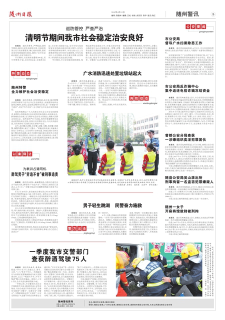 本报讯 通讯员常军、严坤报道:清明节期间,随州公安机关按照市委、市政府和省公安厅的部署要求,精心组织部署,狠抓各项安保措施落实落地,确保了全市社会政治稳定、治安平稳有序。 节日期间,共