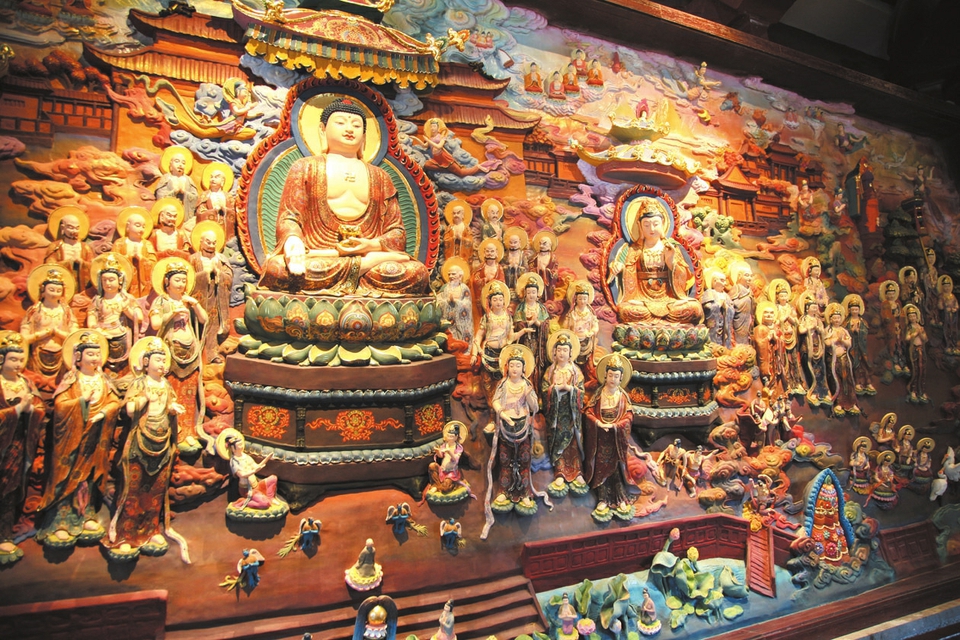 金顶南立面青石浮雕壁画为“灵山盂兰会”情景图。