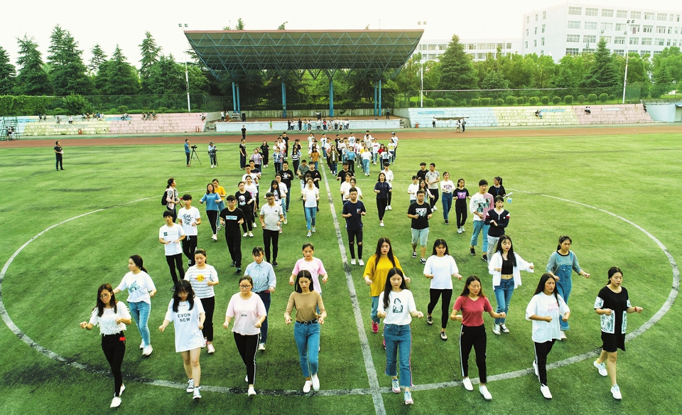 随州职业技术学院参加寻根节拜祖大典仪式的学生,加紧开幕式方阵、花车排练。 (本报记者 李文军摄)
