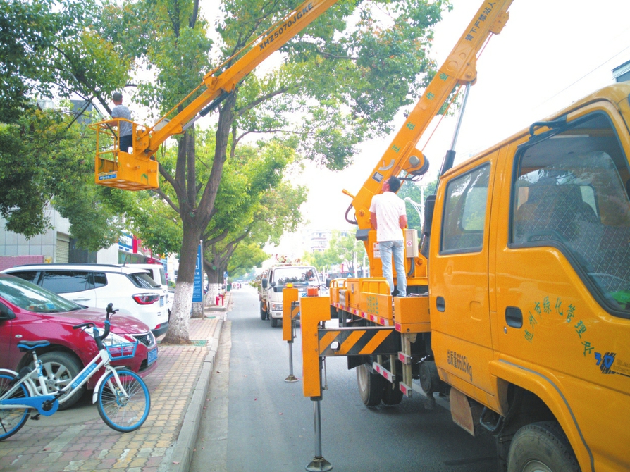 市园林部门修剪行道树残枝败叶,迎接寻根节。(本报记者 王璟天摄)