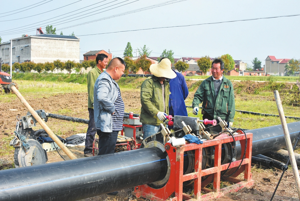 曾都区在新一轮高标准农田建设中,注重节水农业建设,安装输水管道,让灌溉用水直接通过管道输送到农田,减少了跑冒滴漏和水分蒸发,每年能节水35%左右。图为连日来,工人正在万店镇黄畈村八组焊接输水管道。(本报记者 唐天才 通讯员 张立摄)