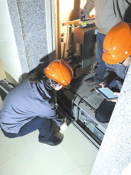 湖北特检院随州分院电梯检验人员日前对随州市迎宾花园小区电梯进行检验检测,确保小区住户安全出行。图为电梯检验人员正在对电梯轿门门刀至层门地坎间隙进行测量。(通讯员 王彦天摄)