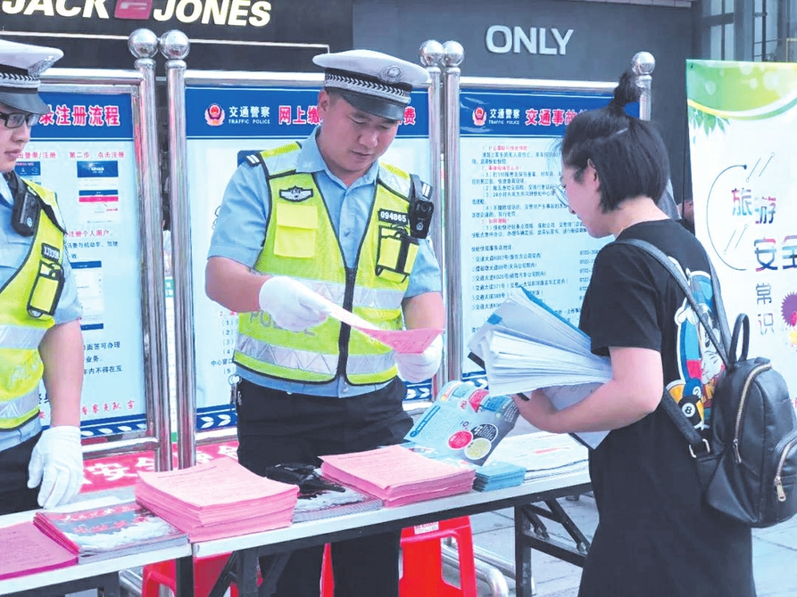 近日,随州交警在青年路大润发广场集中开展“安全生产月”宣传咨询日活动,以“全面落实企业安全生产主体责任”为主题,通过发放交通安全宣传单、宣传折页、摆放宣传展板、接受现场咨询等方式,向广大群众特别是驾驶员宣传交通违法行为的危害性。(通讯员 孔会平摄)