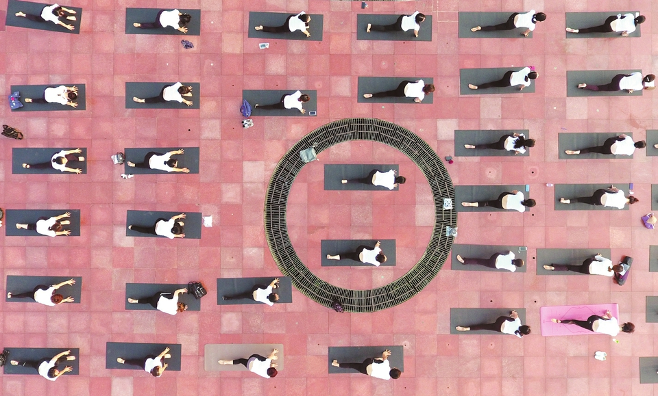 6月21日是第四个国际瑜伽日,随城数十名瑜伽爱好者在明珠广场举行了一场户外瑜伽活动,迎接国际瑜伽日的到来。(本报记者 徐斌摄)