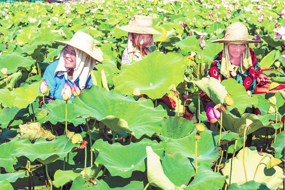 广水市城郊街道办事处油榨桥村引进湖北鑫绿生态农业有限公司投资300多万元,种植太空莲1050亩,吸引大量游客观光休闲。该村太空莲产业采取“企业主体、群众参与”机制,目前已有96个农户入股参与,公司日常管理用工优先考虑本村贫困村民。图为村民正在采莲蓬。(通讯员 熊言澄摄)