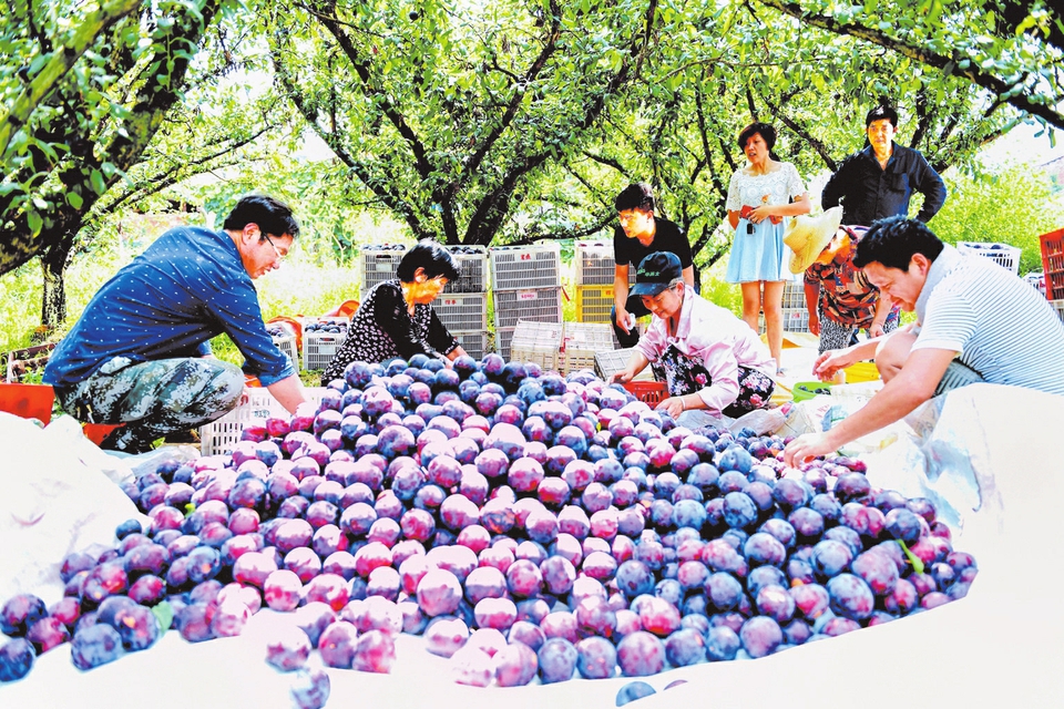 7月10日,随县厉山镇灯塔村果农赵学文10多亩宝石李被武汉果商抢购一空。图为赵学文组织民工对水果进行分选和装箱。 (本报记者 李文军 通讯员 韩铁流摄)