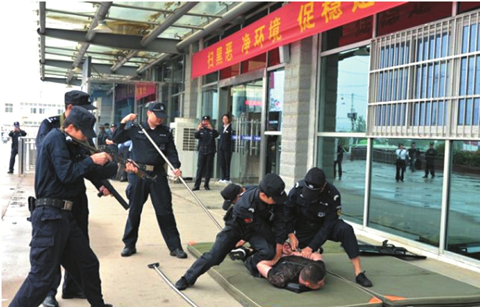 面对突发险情,车站内处突分队人员当即持盾牌、防爆叉、橡胶棍快速截住“暴恐分子”。“暴恐分子”被拦截后往站外广场北侧逃窜,正在广场巡逻的防暴处突民警闻讯冲上来,将其合围制伏,并押离现场(如图)。与此同时,车站安保人员迅速疏散候车室内外旅客,联系医院救护车,将“受伤”安检员紧急送往附近医院救治。