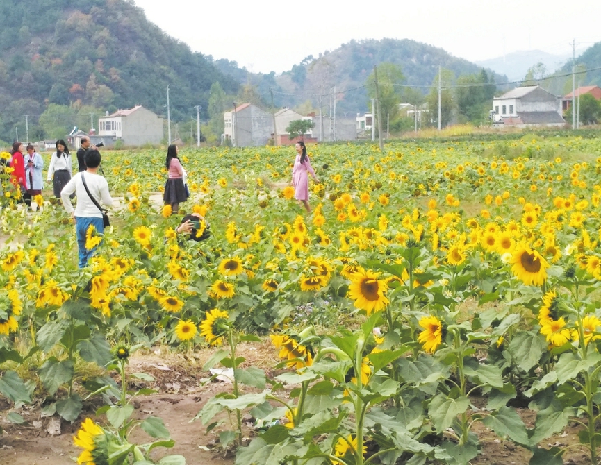 10月13日,广水市武胜关镇桃源村游人如织,游客们在向日葵花海中游玩赏花、拍照留影。(特约记者 彭晓华摄)