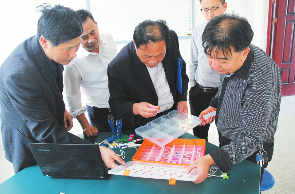 10月11日,曾都区科学技术协会对全区中小学科普教育情况进行督查,图为府河镇中心小学学生用希沃一体3d打印机,制作出自己设计的电子积木。 (通讯员 多思摄)