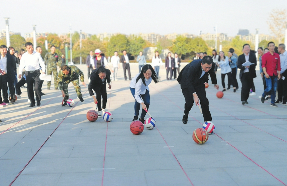 11月2日,市政务服务中心组织窗口职工开展趣味文体锻炼活动,提升职工精气神,促进窗口服务质量提升,打造良好的发展环境。图为赶“猪”跑比赛。(随州日报全媒体记者 冯家园摄)