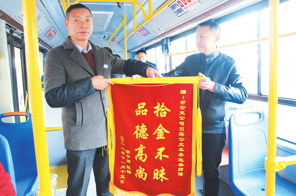 11月19日上午,市民胡先生带着一封感谢信和锦旗来到市公交公司,向拾金不昧的公交车司机李运春(左)致谢。 11月5日,胡先生的女儿乘坐16路公交车时不慎将手提袋遗落在座位上,袋中装有2万元现金、手机、钥匙、银行卡、身份证等物品。公交司机李运春拾金不昧,胡先生女儿的手提袋及袋内物品失而复得。(随州日报全媒体记者王璟天摄)