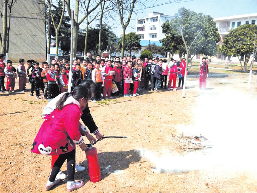 今年三月二十五日是第二十四个﹃全国中小学生安全教育日﹄,我市各中小学校集中组织开展﹃关爱生命·快乐成长﹄为主题的生命教育专题活动,通过生命教育主题课堂教学、安全应急逃生演练等方式,向孩子们普及安全知识,提高避险自救能力。图为,随县唐县镇鲁城小学的孩子们,课间在老师的指导下学习使用灭火器。 (随州日报全媒体记者陈巧玲 通讯员 方晓东摄)