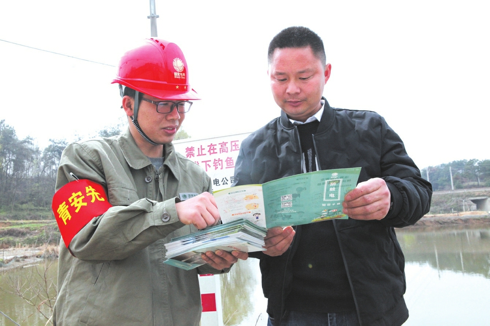 3月26日,国网随州供电公司青安先锋在随县淮河镇为该镇鱼塘主介绍防触电知识。图为讲解现场。(随州日报通讯员 陈孜孜摄)