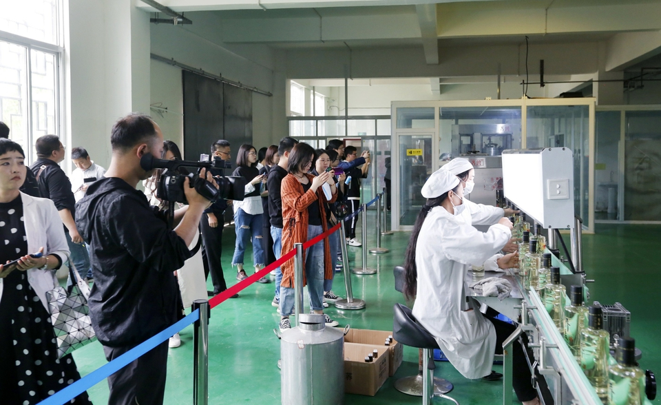 湖北万福酒业是万福店农场招商引资亿元企业之一,该公司结合随州地域特色,打造特色香菇酒、蕙兰玉液、银杏酒等保健功效酒,赢得市场认可。图为4月26日,中央、省、市融媒体采访团在该公司参观采访。 (随州日报全媒体记者徐斌摄)