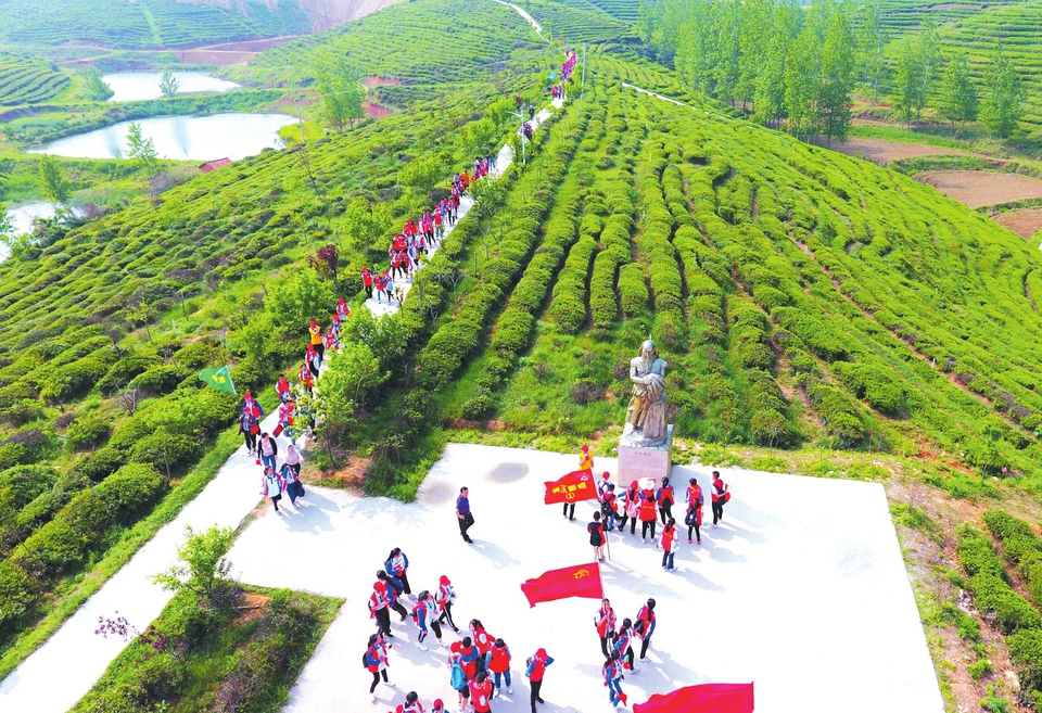 4月26日下午,随县洪山镇云峰山万亩茶园风景区,一群身着红马甲的孩童穿行在绿色的茶垅间,来到一尊炎帝神农的雕像前。