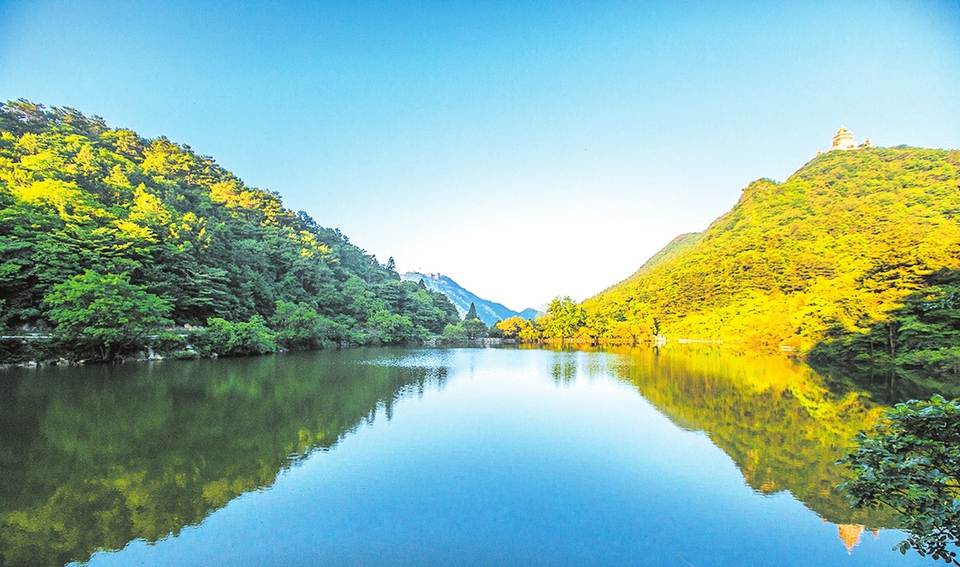 出了两王洞去白龙池,笔者进入了绿色的海洋。白龙池古称南池,位于宝珠峰、悬钩山、笔架山之间,海拔高程840米,湖面20700平方米,水深3米。导游说白龙池水质优良,终年不涸,为富水源流。站在白龙池边,笔者看到这里地形开阔,植被繁茂,群山环抱,就想起了“闲上山来看野水、忽于水底见青山”的意境。高山悬湖,无论干旱多久永不枯竭,让白龙池成为一道亮丽的奇观。