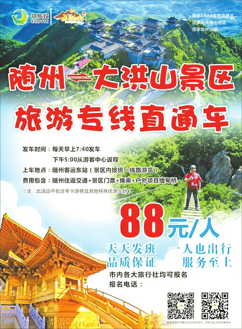 见到蓝天与青山的倒影。这里还有近八公里的飘流河道。清晨与傍晚,都能见到在此休闲娱乐的村民。大洪山花果海位于黄木淌村,是大洪山现代观光农业的一个代表,四季有果,月月有花。它用地近2000亩,栽种有80多种水果,花木10余种,集种植、采摘、休闲观光等于一体,带动周边村组300余人就业。其最终目的实现山上赏花、山川戏水、林间品果、路边采摘,车从山间走、人在果海游、品味农家乐、果飘四季香。庹家村郭耀文月季园位于333省道路边,用地两百亩,月季品种有十几种,以树状月季为主,不仅有可观的经济收入,也成为百里画廊上的靓丽一景,国道上常有停车观赏者。庹家村引进的上景园林,流转土地800余亩建设大洪山植物园项目。该项目按照4A景区标准,以培植高端名贵观赏植物为主,目前正在全力推进主园区、生态水景和游客接待中心建设,建成后将成为景区西入口一道靓丽的风景线,广大游客的到来将极大推进庹家村民增收致富。大洪山神农茶业根茶有限公司的产品,以出口为主,去年出口3000万美元,为百里画廊增彩。
