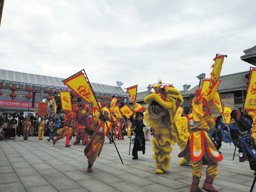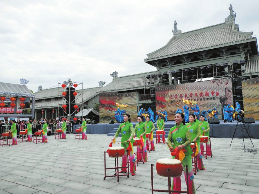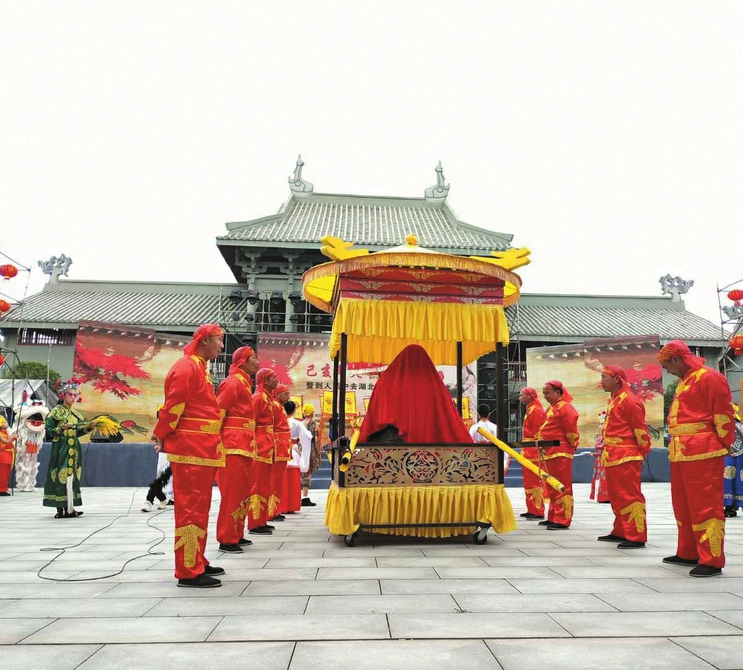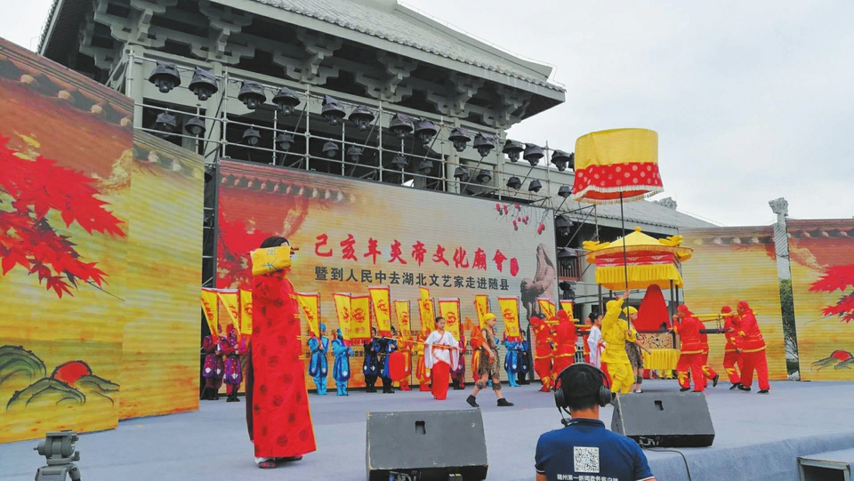 庙会的主会场,在随县烈山脚下炎帝故里风景区游客服务中心旁的日中商业街广场。请圣仪式之后,《烈山大阵》震撼登场。今年的庙会将持续3天,先后进行荆楚红色文艺轻骑兵演出、随县各乡镇特色文艺节目展演、随县非遗和随州花鼓戏展演。此外,庙会现场还以展板的形式展示随州民俗文化,并展销随州民间土特产、民间美食等。看表演、尝美食、品文化,好看、好玩、好吃,今年的炎帝文化庙会绽放出更多的精彩。本版摄影:徐斌 陈云
