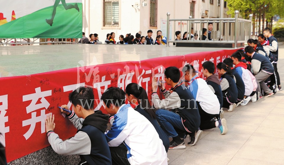 日前,曾都区实验中学组织老师学生在横幅上签字,承诺做有素质的随州人,并发动学生号召家长摒弃不文明行为,为品质随州建设创造文明有序的环境。(随州日报全媒记者 冯家园)