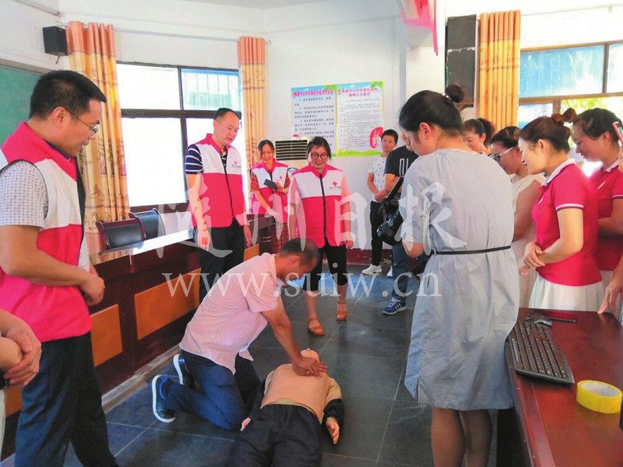 6月14日,广水市卫健局、红十字会组织专业人员在陈巷镇中心中学向学生们传授心肺复苏应急救护知识。暑假临近,溺水、触电、火灾、烫伤事件时有发生,开展﹃﹁救﹂在身边,应急宣教﹄主题活动正当其时。(随州日报通讯员刘小斌、蔡源摄)