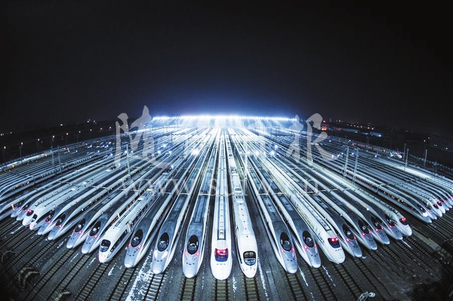 图片1-2018年2月1日凌晨,动车组停靠在武汉动车段的存车线上,准备进行检修和保温作业。 新华社记者肖艺九摄