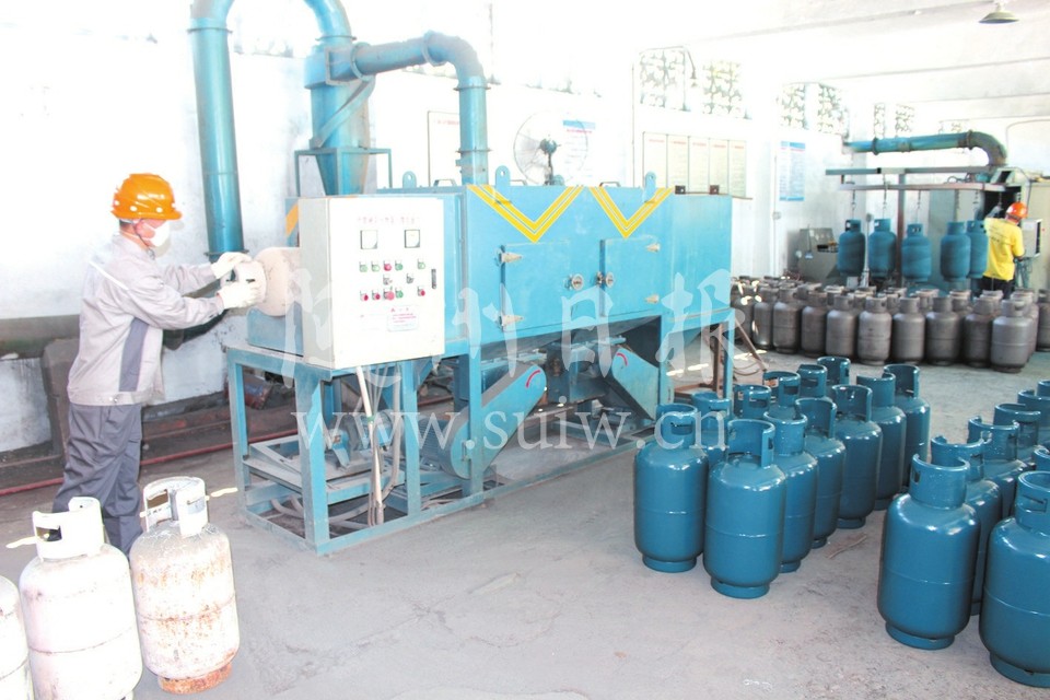 湖北特检院随州分院绷紧安全监管弦,尽职尽责排查检验安全隐患,保障液化石油气瓶安全,图为气瓶检验人员正在进行液化石油气瓶除锈作业。 (随州日报通讯员吴坚、王煜成摄)