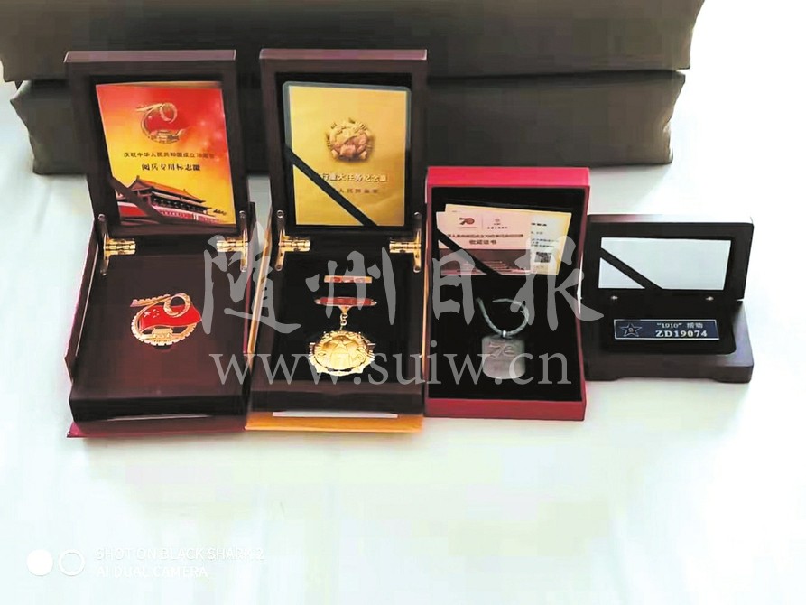 10月10日,随县小林一中教师李和平和庞声艳收到了由中国人民解放军总部为其儿子颁发的银质奖章一枚。原来,他们的儿子李仁龙参加了国庆70周年大阅兵,并且荣立集体三等功一次,受到了国家和军队的表彰。图中左一为李仁龙。(随州日报通讯员 李仁泰 喻先富摄)