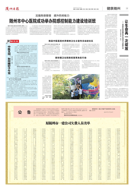 随州日报讯(通讯员刘明秀、谭坤)9月26日至28日,由随州市医学会医院感染管理专业委员会、随州市中心医院举办的“基层医疗单位医院感染控制能力建设培训班”在随州市中心医院龙门院区成功举办,