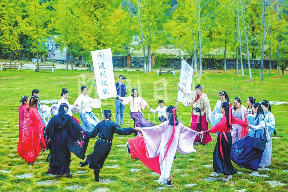 随州汉东雅聚汉服社近日组织汉服爱好者来到曾都区洛阳千年银杏谷景区,在五佬树广场着传统汉服盛装表演《盛唐夜唱》,吸引了许多游客驻足观看。(随州日报全媒记者 李文军摄)