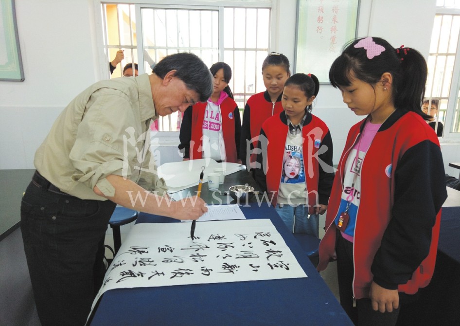 10月23日,广水市应山街道办事处诗联学会组织诗联书法家来到应办第三完全小学,为该校师生讲授诗词知识,并挥毫泼墨,创作了一批诗词书法精品,为“书香校园”建设留下了浓墨重彩的一笔。这是该市创建“湖北诗词之乡”、诗词文化“七进”活动之一。(随州日报通讯员程晓斌摄)