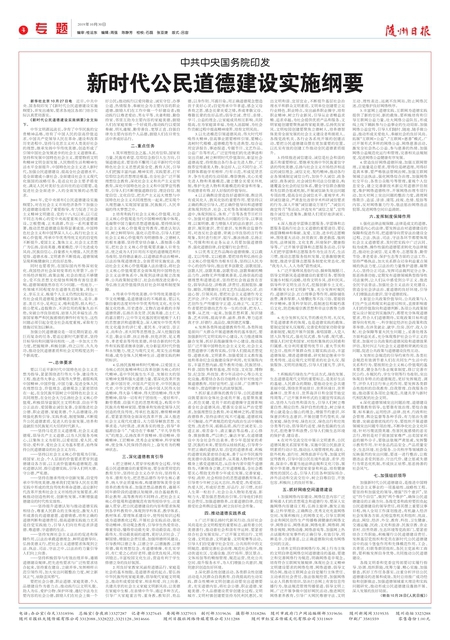新华社北京10月27日电 近日,中共中央、国务院印发了《新时代公民道德建设实施纲要》,并发出通知,要求各地区各部门结合实际认真贯彻落实。 《新时代公民道德建设实施纲要》全文如下。 中