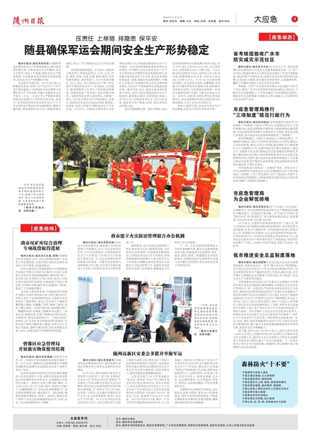 随州日报讯(通讯员邹传政)为确保军运会期间安全生产形势持续稳定,随县坚决贯彻落实省、市相关会议及文件精神,压实工作责任、细化工作措施,狠抓安全生产检查督查、安全隐患排查治理和应急值班值守