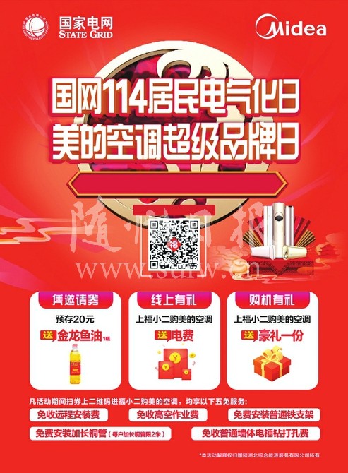 11.2—11.11来国网商城福小二购美的空调电网连万家 共享电气化 凡活动期间扫券上二维码进福小二购美的空调,均享以下五免服务:免收远程安装费免收高空作业费免费安装普通铁支架免费安装加长铜管免收普通墙体电锤钻打孔费 为提升居民电气化水平,国家电网公司依托国网商城线上销售终端“福小二”APP信息化平台,推出“114居民电气化日”活动,本次活动电器产品覆盖20多个品牌,上千款家电,优惠力度大,诚邀您的参与。