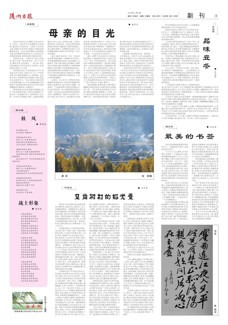 ● 谢万文 我在母亲的目光中懂事,在母亲的目光下成长。母亲的目光装载着岁月的沧桑,蕴含着人生的甘凉。当我打开记忆的大锁,抚摸记忆的年轮,那种令人感动的温馨依然存在。我无论走到哪里,我的
